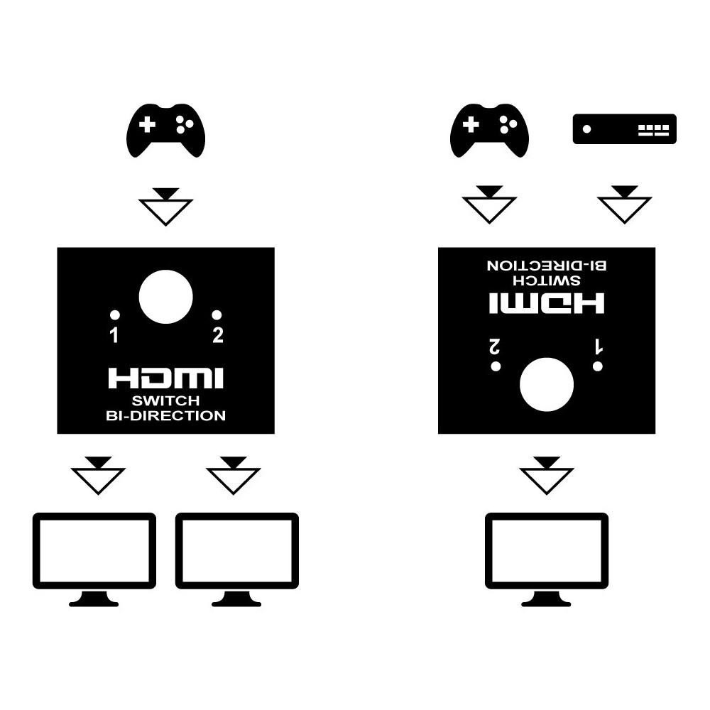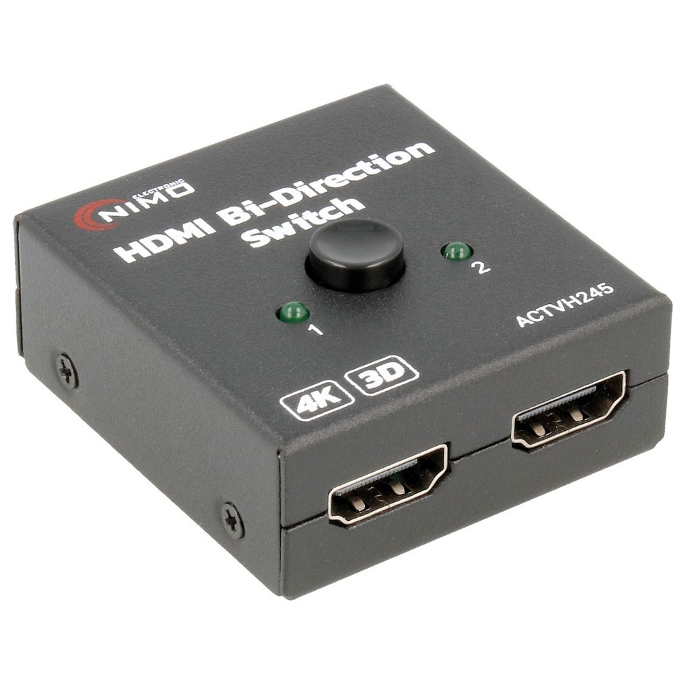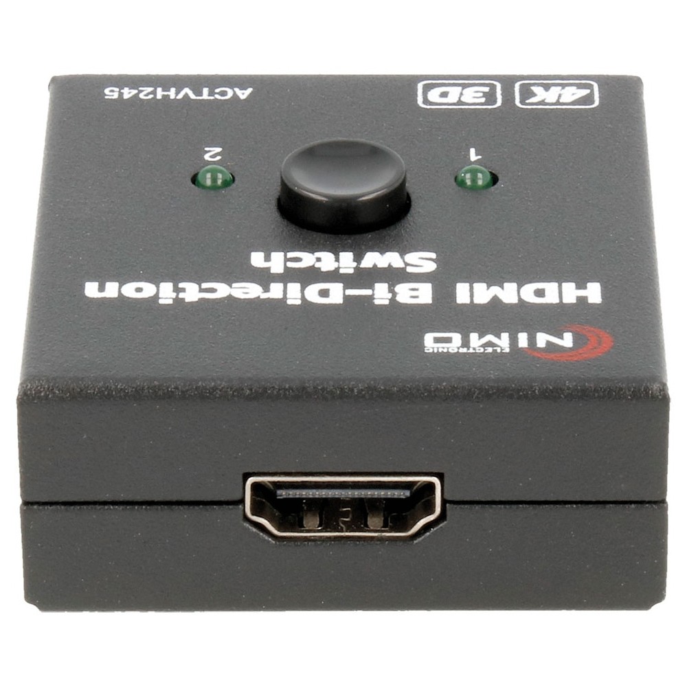 Este conmutador manual bidireccional de 2 puertos HDMI, tiene la ventaja de poder utilizarse en ambos sentidos, tanto de entrada como de salida de señal HD.