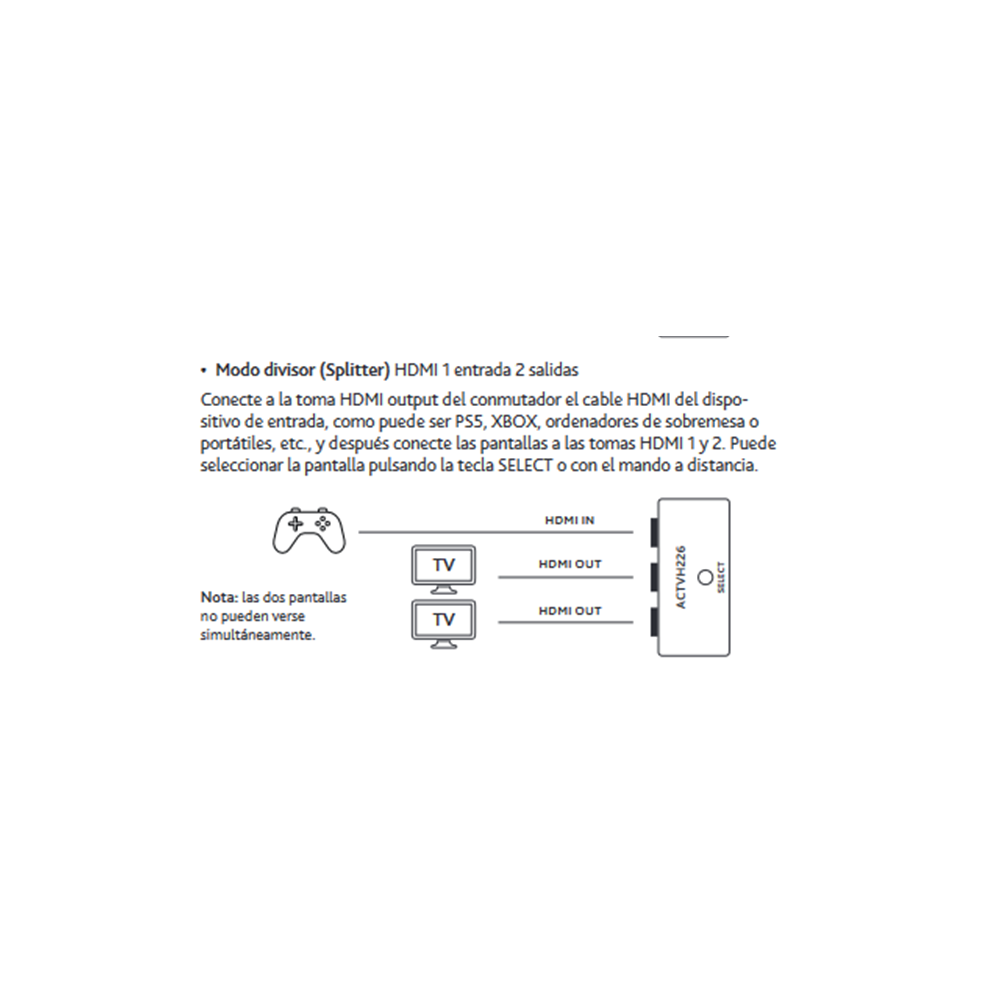 • 1 Entrada HDMI (reproductor de DVD o PS5) a 2 salidas HDMI a Monitor o TV (solo se mostrará en un monitor o TV, según la salida seleccionada 1 ó 2)