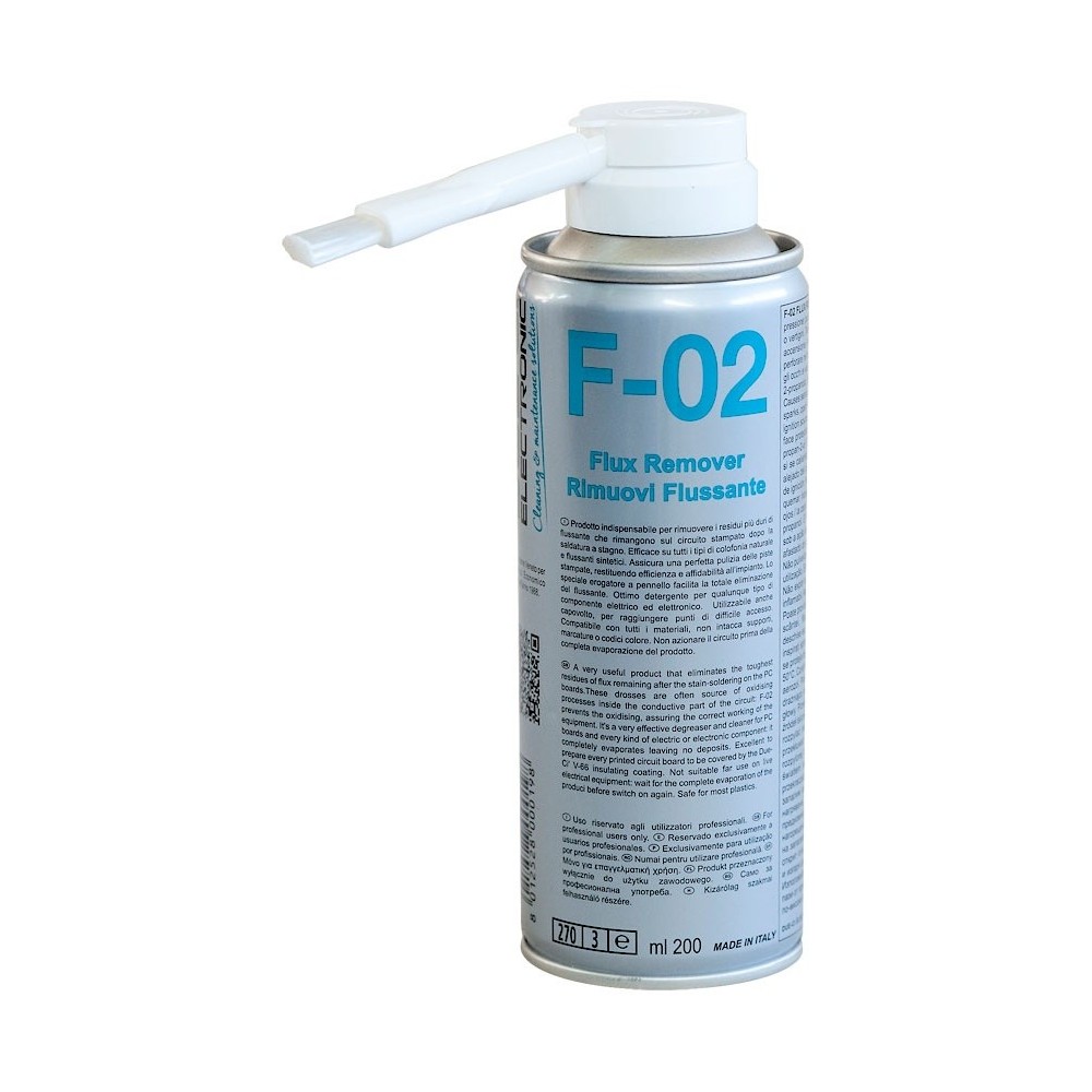 El F-02 elimina los residuos de flux que quedan en las placas después del soldado evitando así la oxidación de los componentes, se evapora rápidamente y no deja residuo