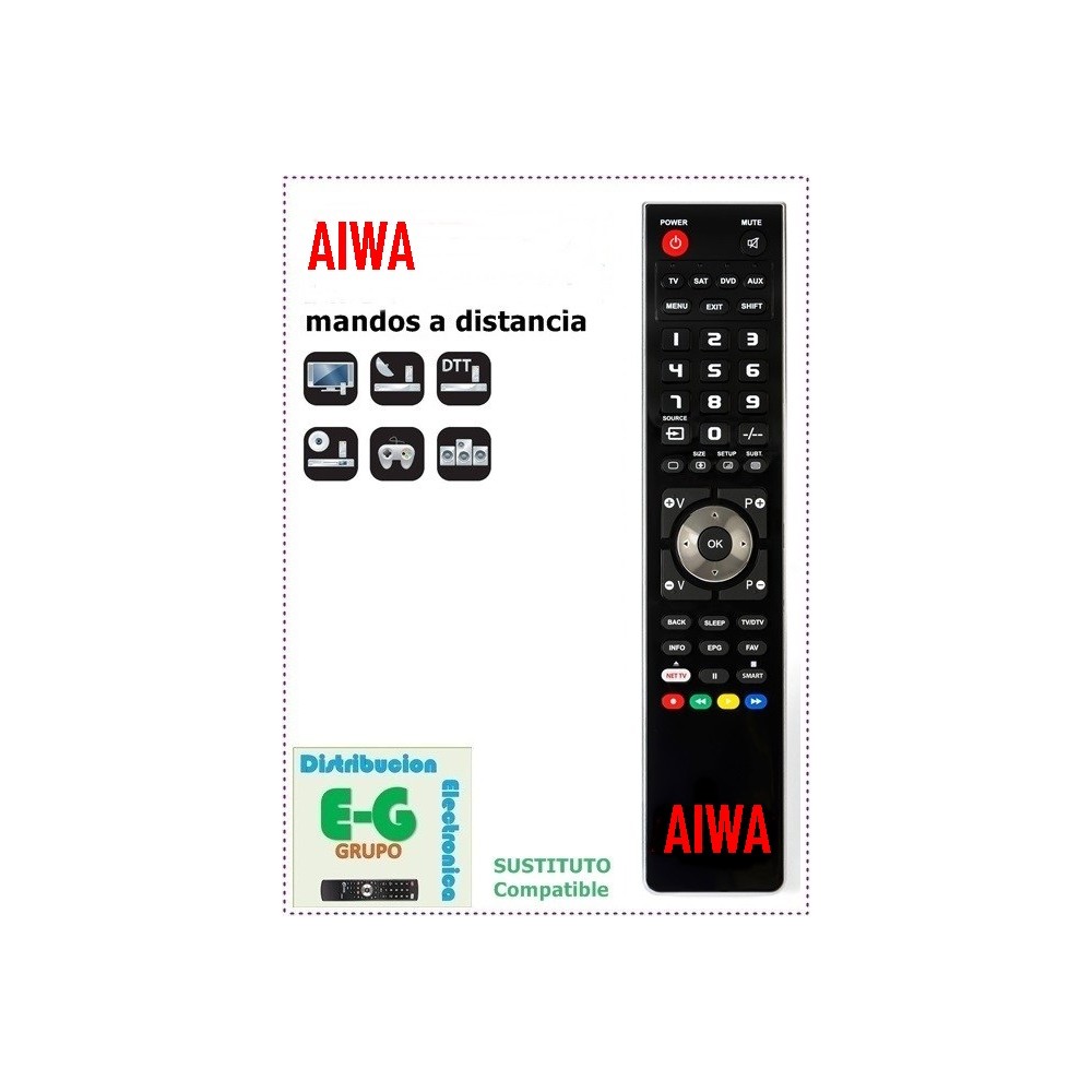 Para sustituir tú mando a distancia original AIWA. Sustituye a todos los modelos AIWA del mercado. Diseñado con una nueva e innovadora tecnología, se puede programar para funcionar en tu TV, DVD, VCR, SAT, TDT, AUX, HIFI, VIDEOCONSOLAS, PROYECTORES.. .  Con este mando se puede acceder a todas las funciones. Es un Mando de Sustitución del OriginalNo es un Mando Universal. No requiere código de configuración. Nosotros Te enviaremos su sustituto AIWA programado para el modelo que nos indiques. Pon las pilas AAA (no incluidas), y comienza a utilizar tu Mando.