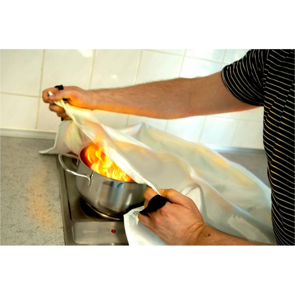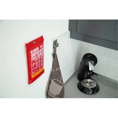 Con esta manta fabricada en fibra de vídrio puede apagar incendios del tamaño de una pelota de fútbol. No apta para fuegos que tengan como combustible grasas o aceites. Cuelgue la manta en un lugar visible y accesible para tenerla siempre a mano en caso de emergencia. Válida para un sólo uso.