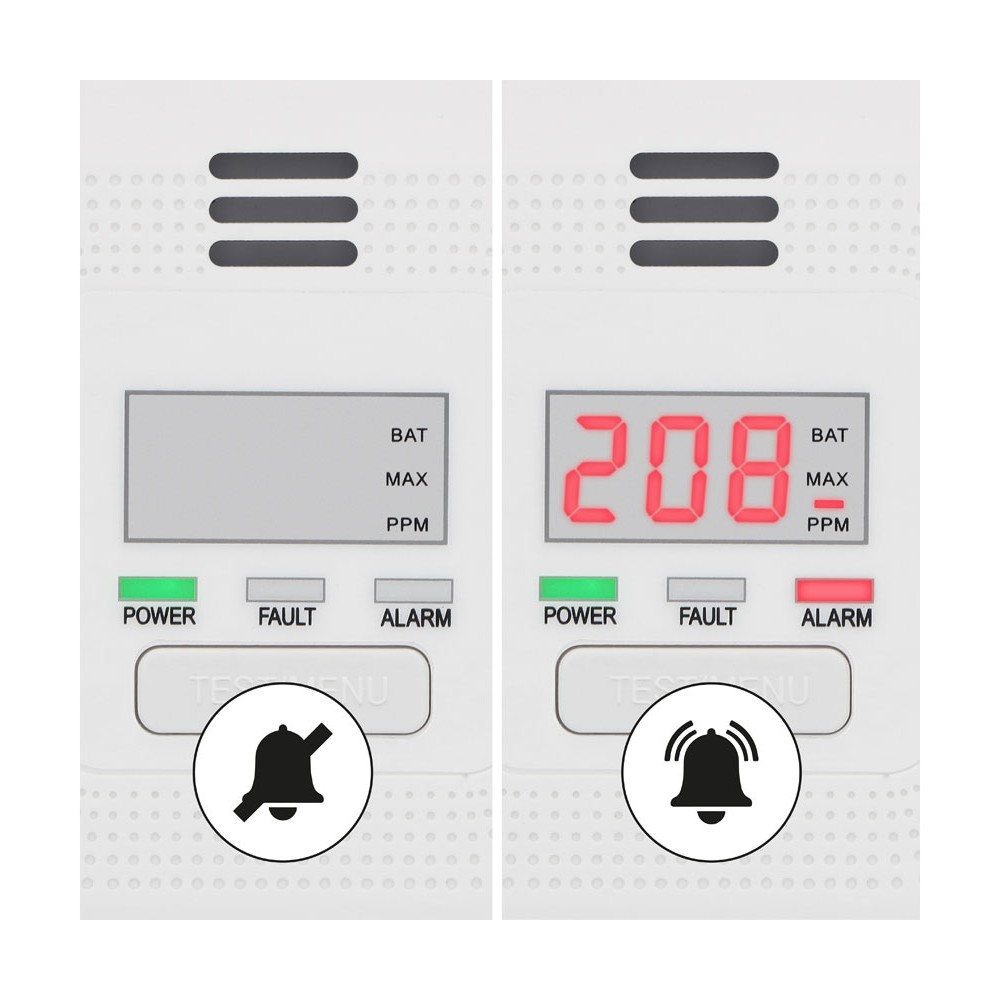 Las alarmas de monóxido de carbono muestran las concentraciones de monóxido de carbono en ppm (partes por 1 millón de partículas). La ley exige que las alarmas de CO se disparen cuando se detecte una concentración de monóxido de carbono de 50 ppm o más durante 60 minutos.