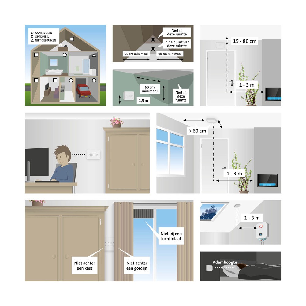 Es recomendable instalarlo en habitaciones con una fuente de combustión (posible fuente de formación de CO) como calderas de calefacción central, calentadores, chimeneas, estufas de pellets, hornos de gas o de leña, etc. En habitaciones sin fuente de combustión, debe instalar el detector a la altura de la respiración.