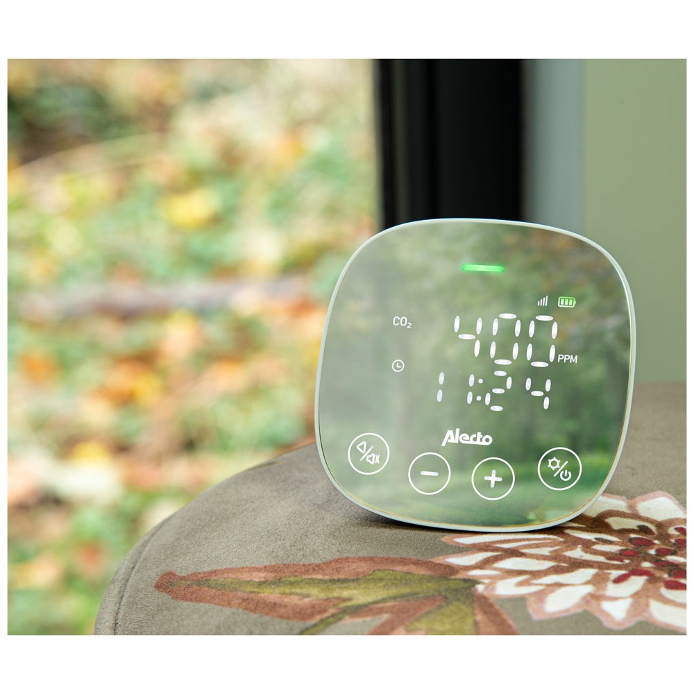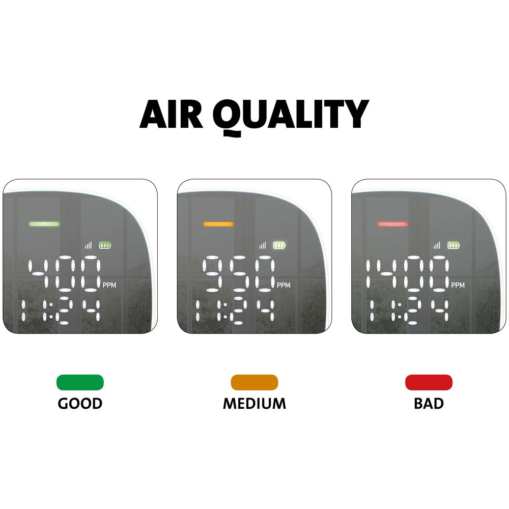 Este dispositivo mide específicamente la concentración de CO2 en el aire de manera profesional. La cantidad de CO2 en el aire es un buen indicador de la calidad del aire en una habitación y puede indicar si se requiere ventilar las estancias dónde se encuentren personas ya que es importante para la salud y el bienestar mantener una buena calidad del aire. Con la información proporcionada por este dispositivo permite saber cuándo es necesario tomar acción.