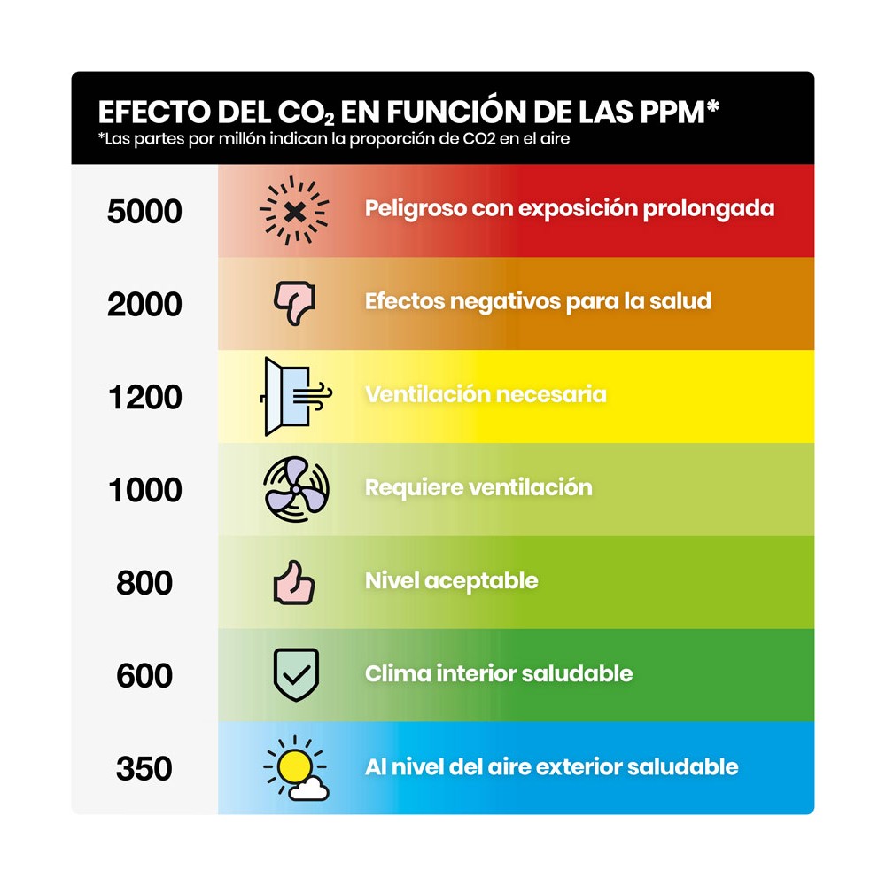 Una alta concentración de CO2 en una habitación limita la inhalación de oxígeno de su cuerpo, causando problemas como la fatiga, pérdida de concentración, dolores de cabeza, sequedad en la piel o en los ojos. También es indicativo de que puedan existir otras sustancias dañinas en el habiente, tales como hongos y puede favorecer la transmisión de enfermedades infecciosas, tales como resfriados, coronavirus o similares.