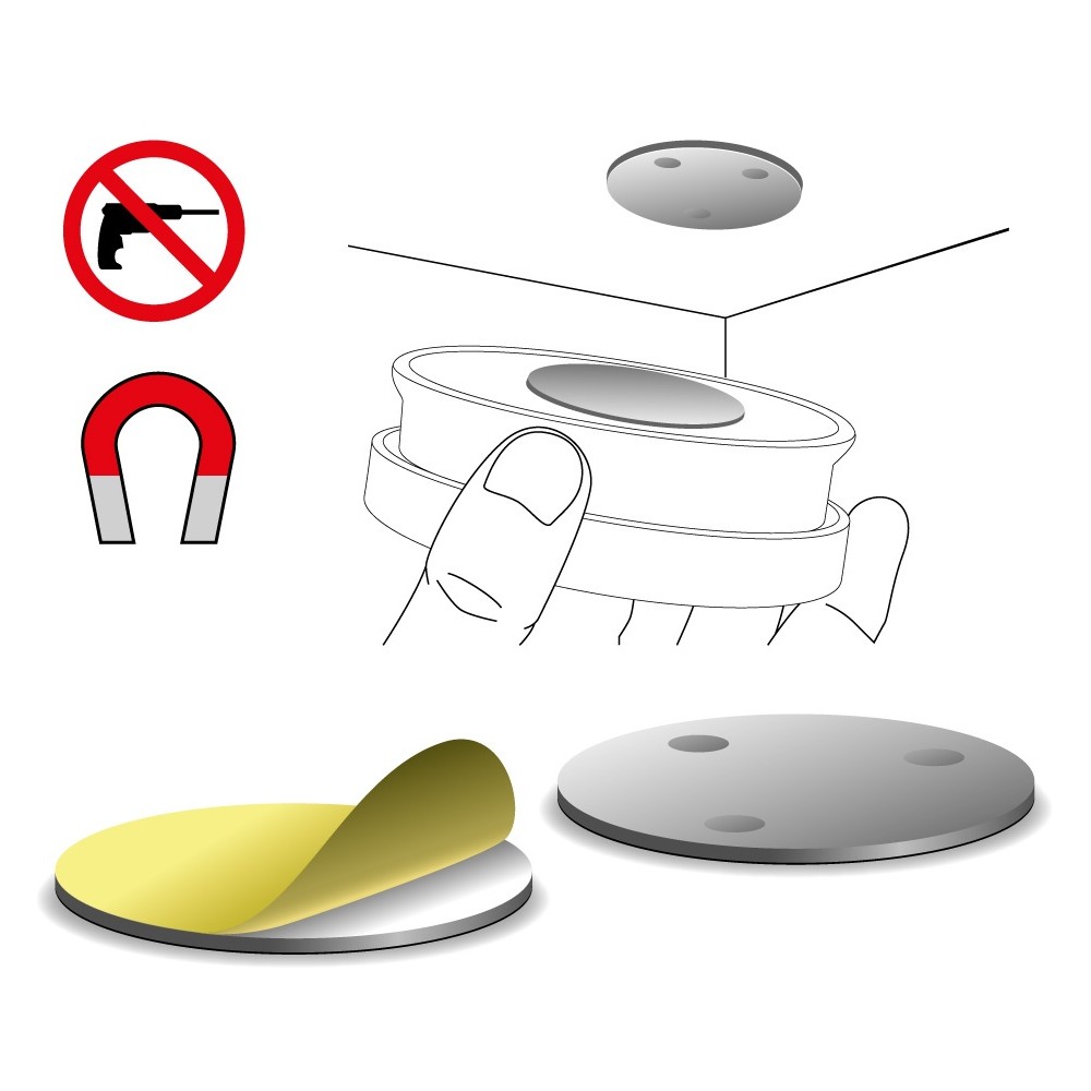 • Coloque primero la placa de metal en el techo utilizando la cinta adhesiva incluida.