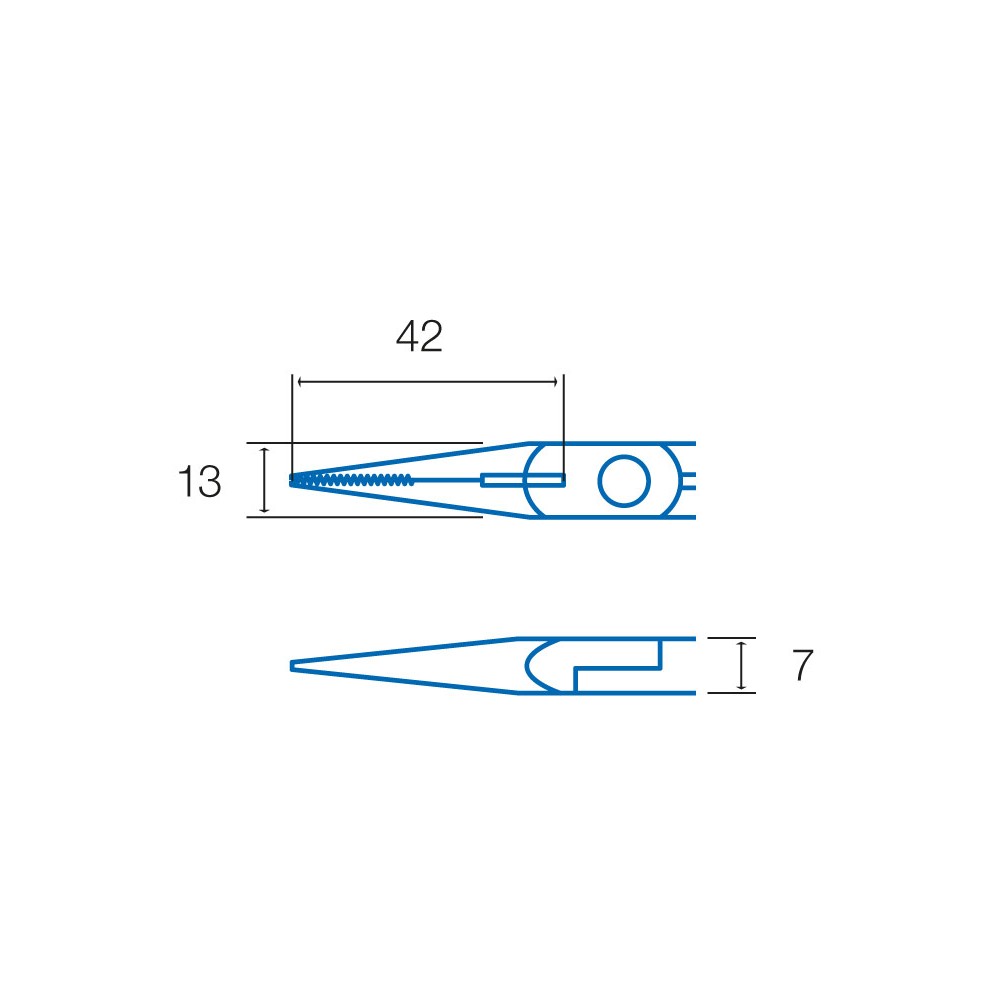 Diseño de punta larga con mordaza dentada para un agarre fácil en espacios estrechos.