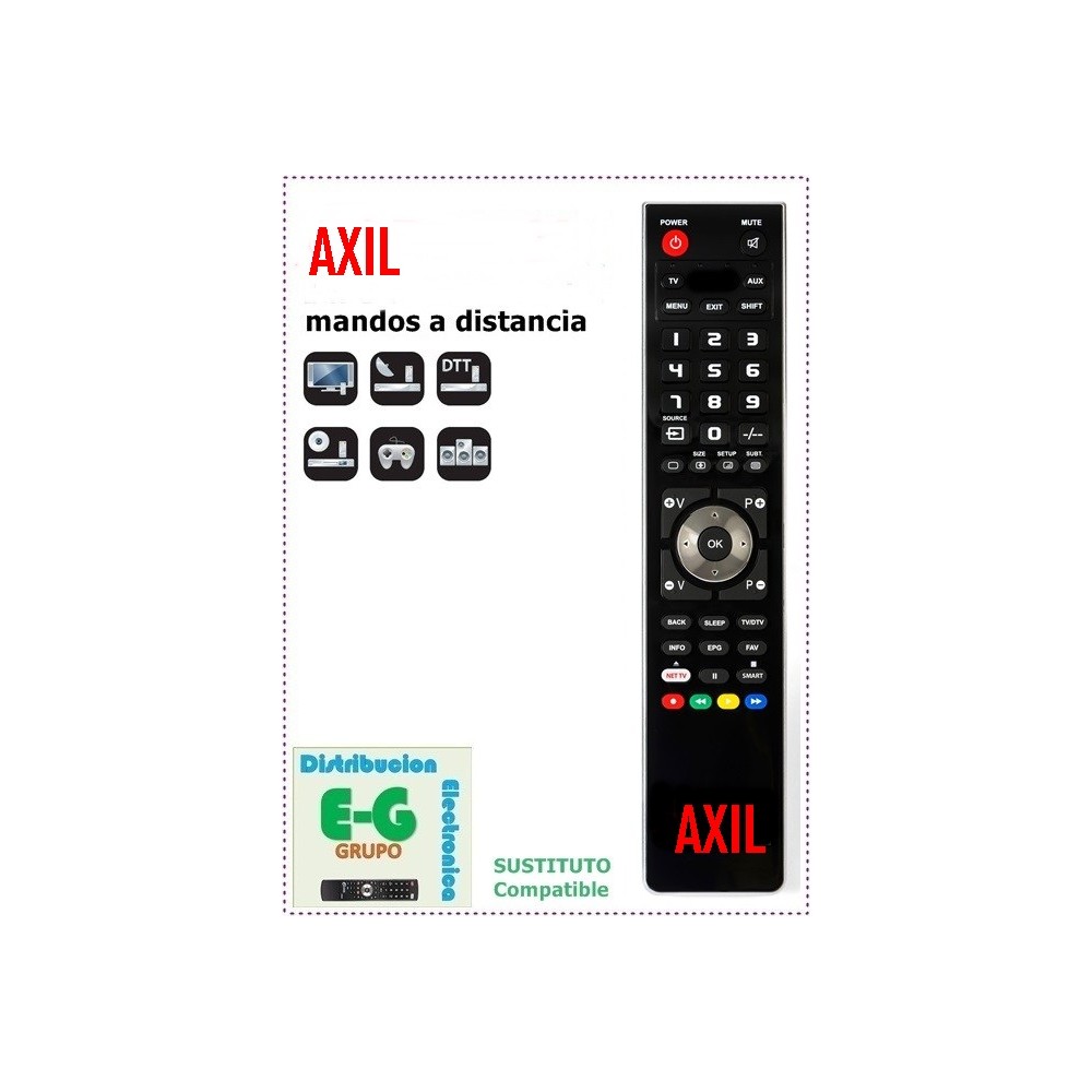 Para sustituir tú mando a distancia original AXIL. Sustituye a todos los modelos AXIL del mercado. Diseñado con una nueva e innovadora tecnología, se puede programar para funcionar en tu TV, DVD, VCR, SAT, TDT, AUX, HIFI, VIDEOCONSOLAS, PROYECTORES.. .  Con este mando se puede acceder a todas las funciones. Es un Mando de Sustitución del OriginalNo es un Mando Universal. No requiere código de configuración. Nosotros Te enviaremos su sustituto AXIL programado para el modelo que nos indiques. Pon las pilas AAA (no incluidas), y comienza a utilizar tu Mando.