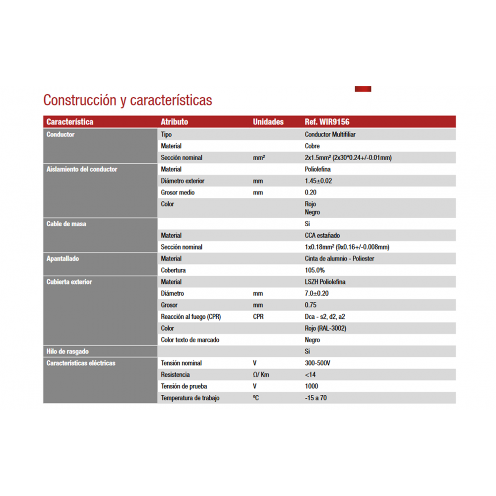• Conductores: 2x1.5mm² (30x0,24mm) Cobre