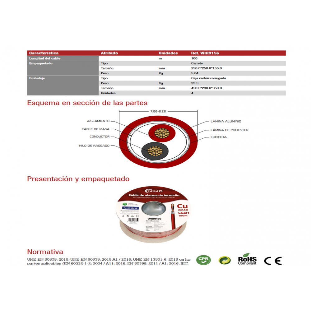 Rollo de Cable blindado para alarma de incendios LSZH, Cobre 100m - WIR9156