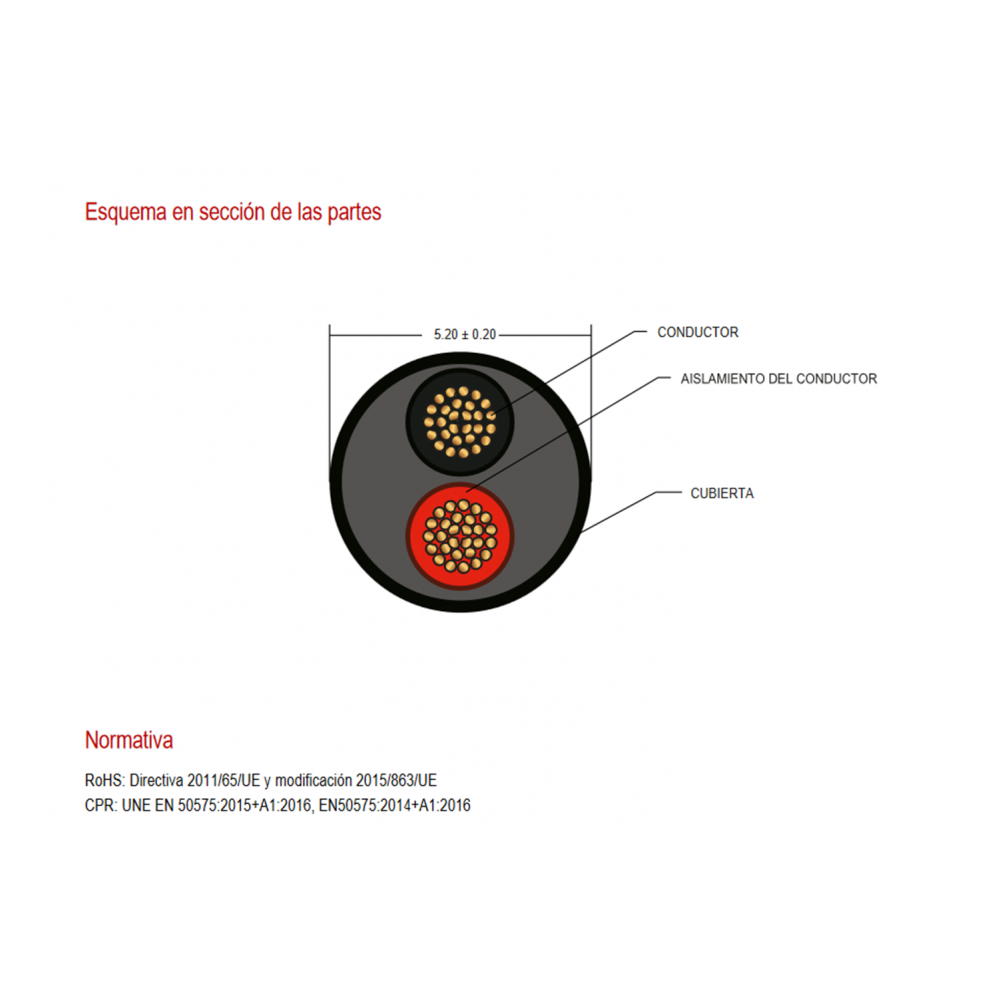 Cable de altavoz con dos conductores flexibles de color rojo y negro inyectados en cubierta protectora negra.