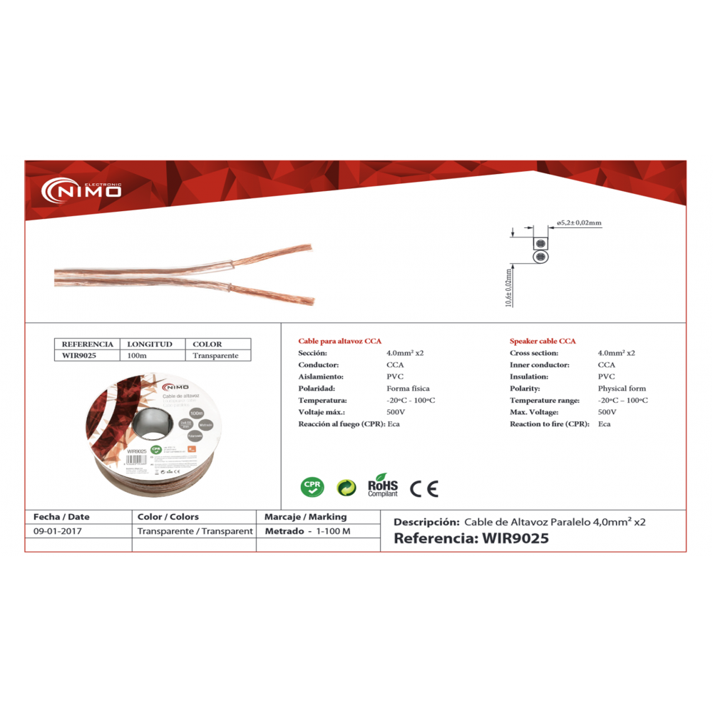 Rollo de cable de altavoz 2x4.00mm Transparente polarizado de 100m - WIR9025