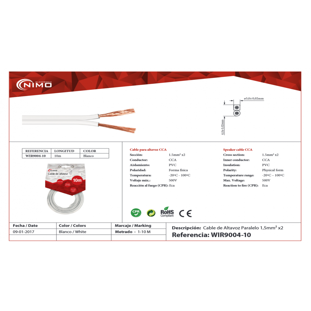 Cable para altavoz 2x1.50mm Blanco Polarizado de 10m - WIR9004-10