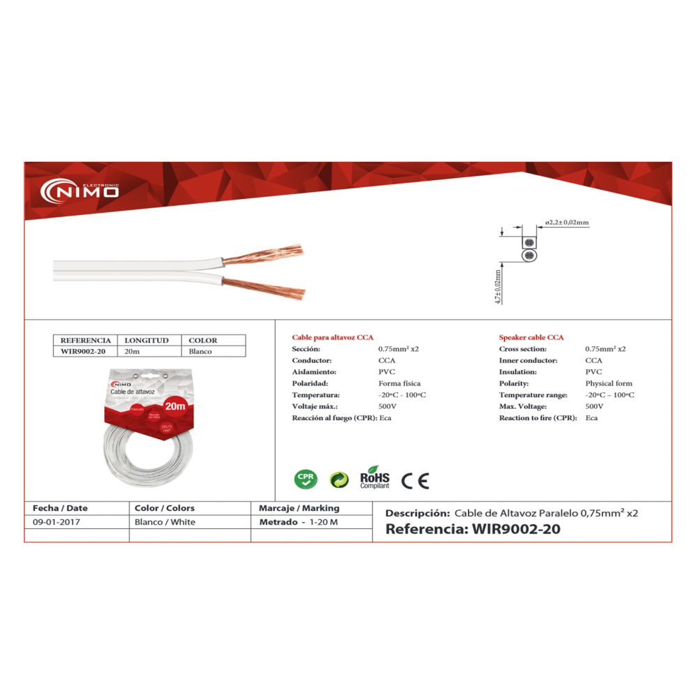 Cable de altavoz 2x0.75mm Blanco Polarizado 20m - WIR9002-20
