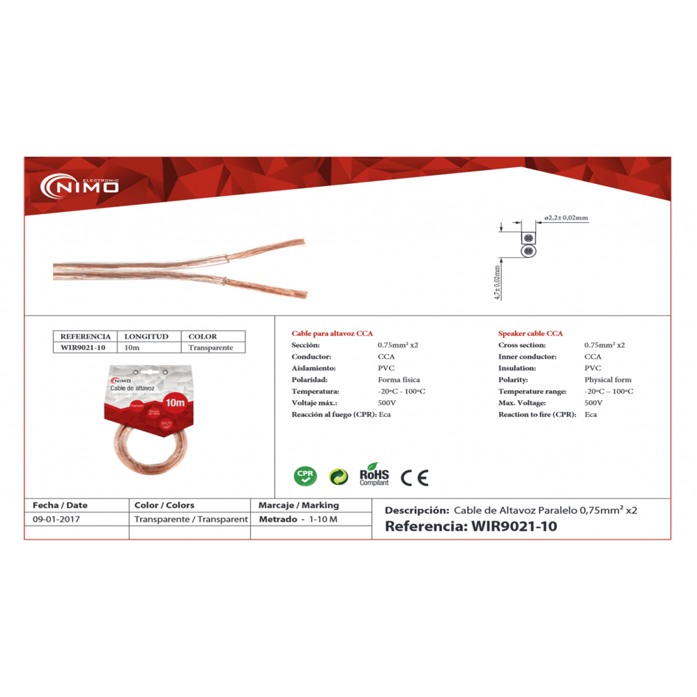 Cable de altavoz 2x0.75mm Transparente polarizado de 10m - WIR9021-10