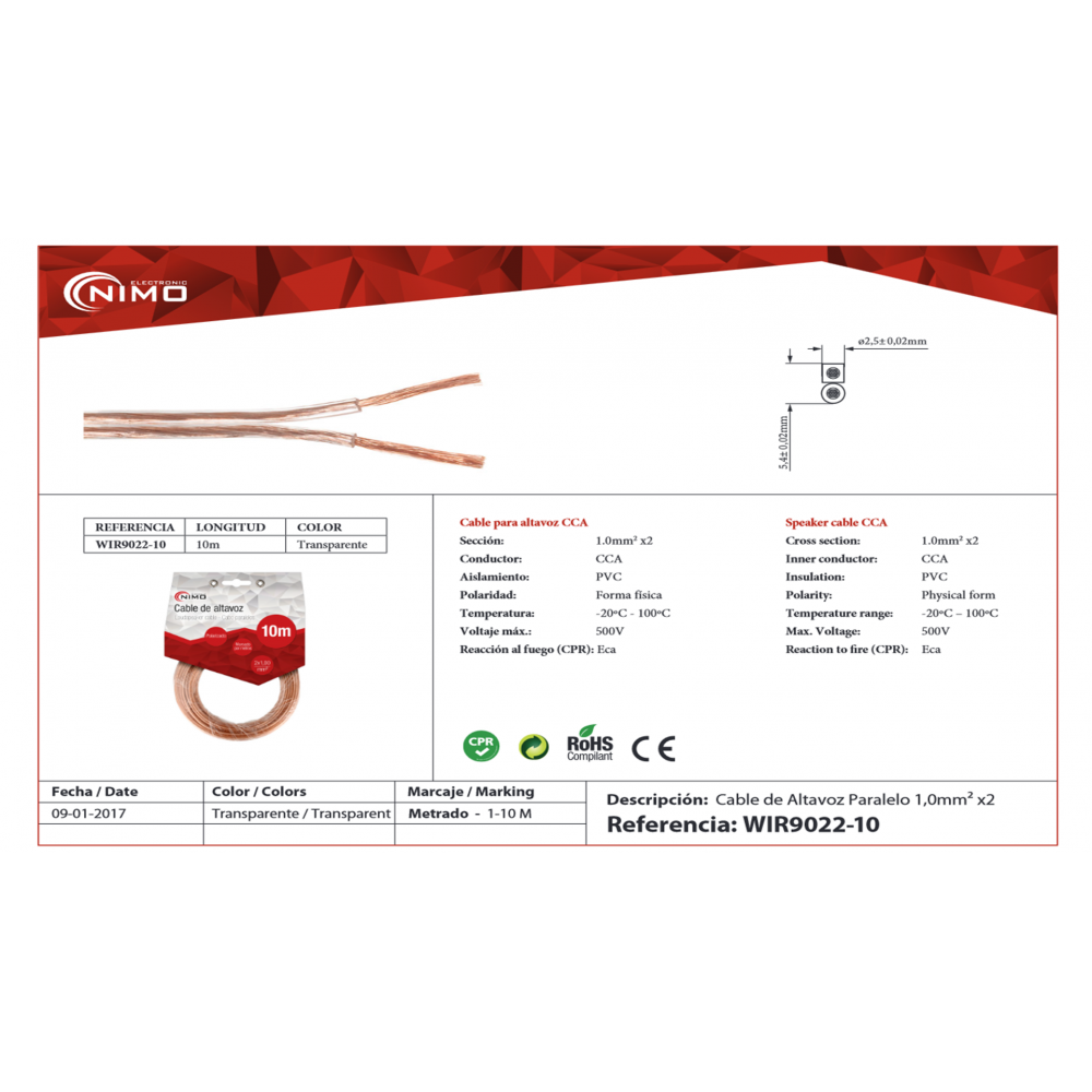 Cable de altavoz 2x1.00mm Transparente polarizado de 10m - WIR9022-10