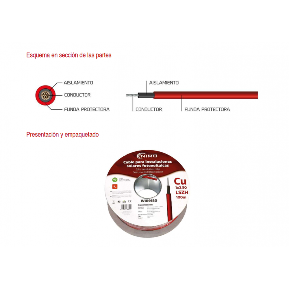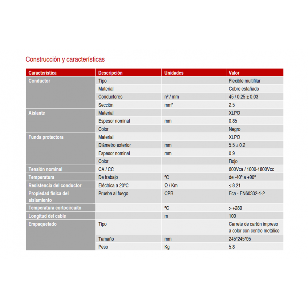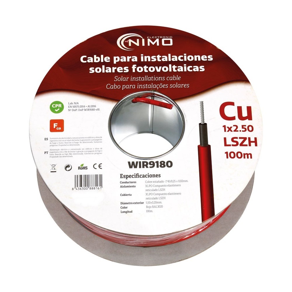 Cable para conexión de Placas Solares Cu-Sn 2,5mm² XLPE LSZH Rojo 100m