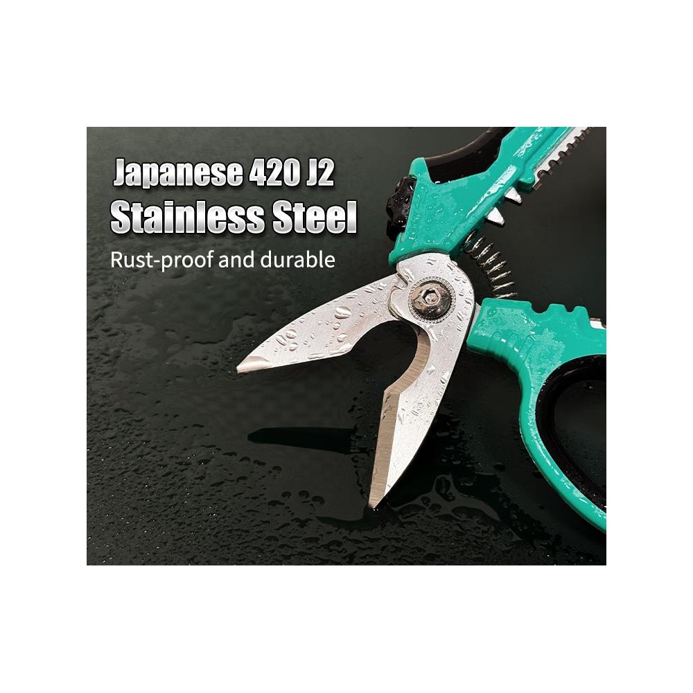 Tijeras profesionales multiusos, fabricadas con acero inoxidable japonés duradero y resistente a la corrosión, con hoja dentada para un corte afilado y limpio, con mango ergonómico que se adapta a la forma de la mano facilitando su uso con comodidad y menos esfuerzo, funda con clip para cinturón