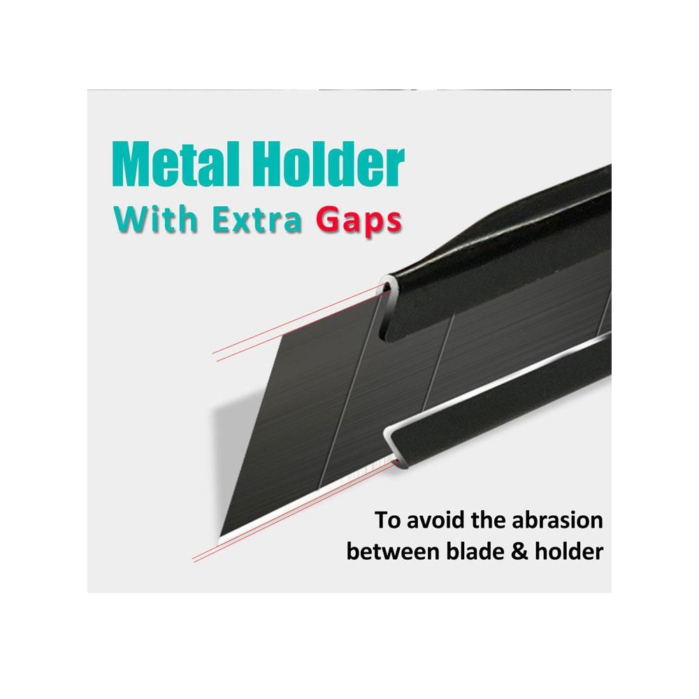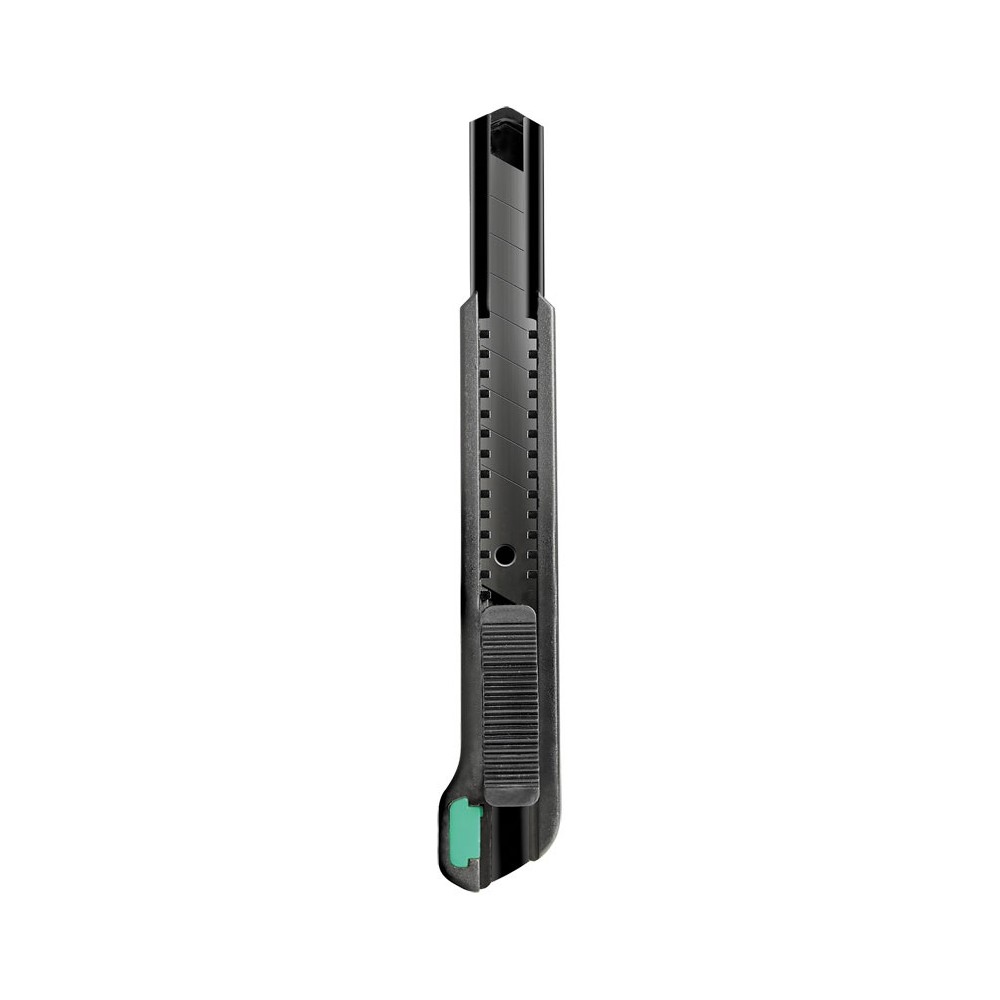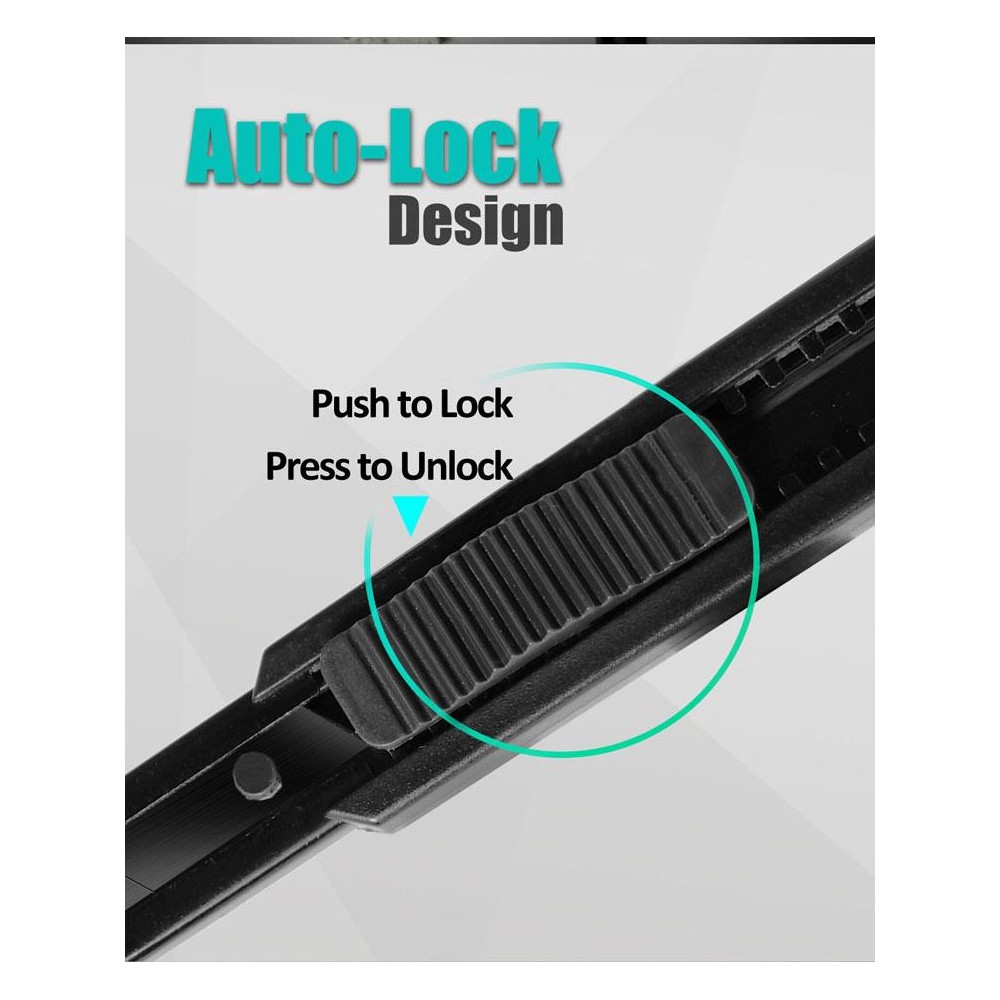 Incorpora sistema de bloqueo de cuchilla automático y retenedor de seguridad. Parte del cuerpo del cutter es metálico para una mayor resistencia y durabilidad.