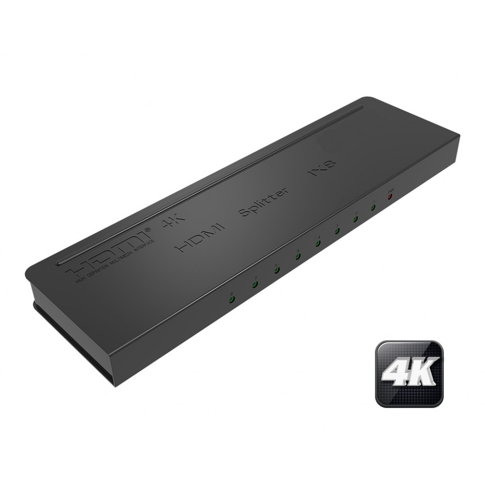 El DIVISOR 4K HDMI Splitter 1x8 utiliza una única fuente de entrada HDMI, para distribuirla a 8 salidas HDMI. El divisor permite dividir fácilmente un dispositivo HDMI en ocho monitores o proyectores compatibles con HDMI. También se puede colocar al final de un cable HDMI largo para regenerar la señal HDMI. La resolución admitida es de hasta 3840x2160 / 30HZ.