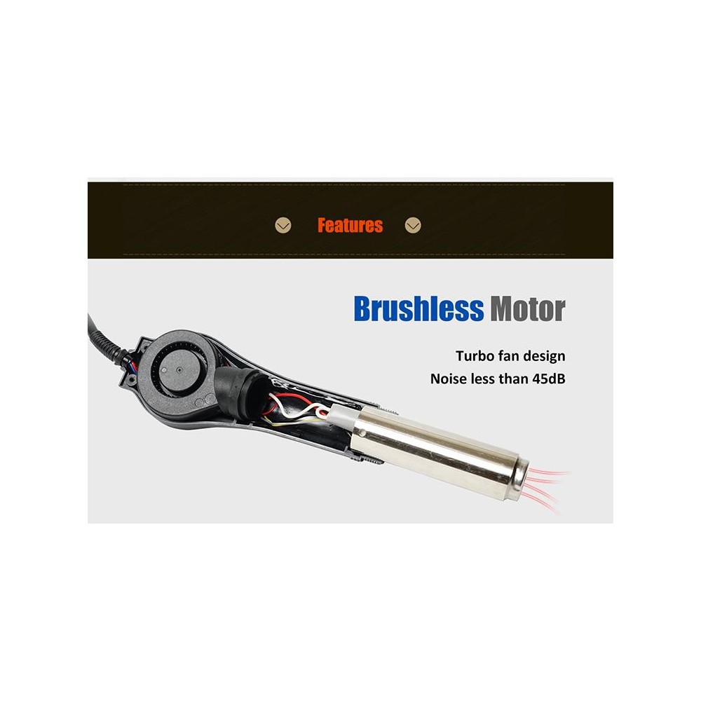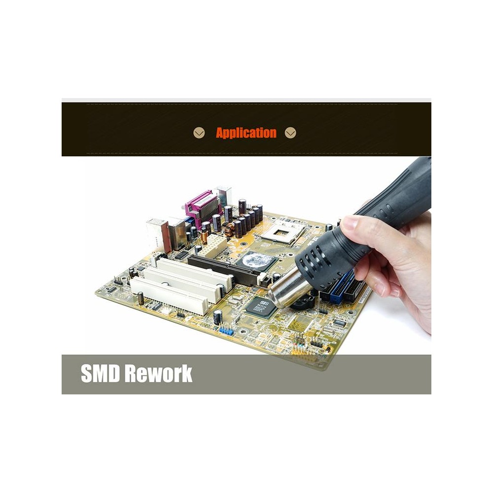 Diseño de sensor de circuito cerrado que proporciona un control preciso de la temperatura del aire caliente. Ajuste de flujo de aire, volumen de aire y temperatura. Diseño de tobera con sensor incorporado para obtener temperatura en tiempo real. Proceso de enfriado automático para prolongar la vida de la resistencia. Estación de carcasa plástica y diseño compacto. Motor sin escobillas muy silencioso con emisión de ruido inferor a 45dB. Soldadura segura de QFP, PLCC, BGA y otros componentes sensibles al calor. También válido para aplicar en termorretráctiles, eliminación de viscosidad, eliminación de lacas y trabajos de precalentado.