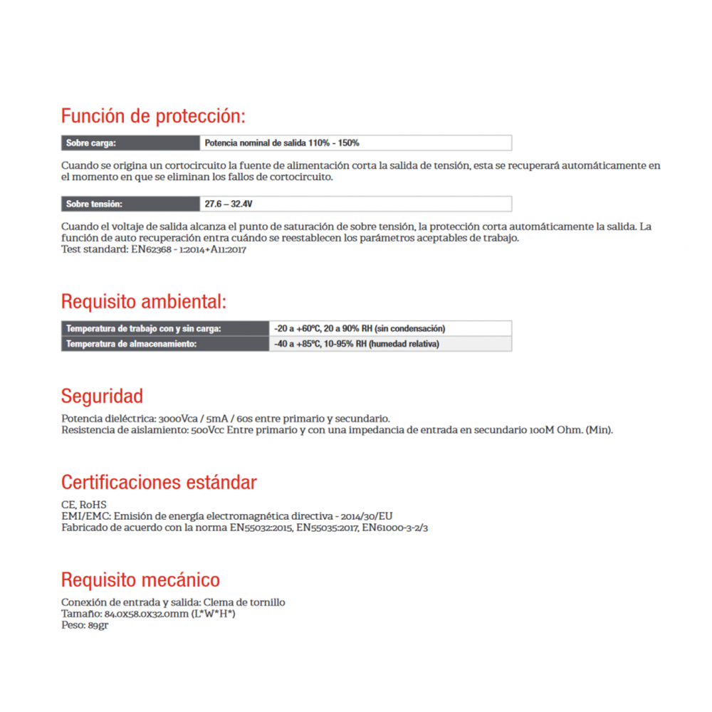 - Voltaje de salida: 24Vcc