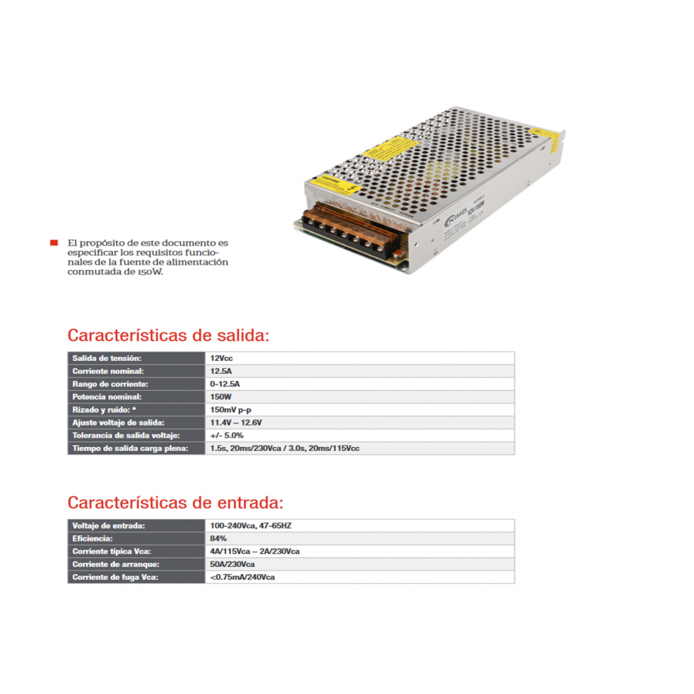 - Amperios: 12,5A, 150W