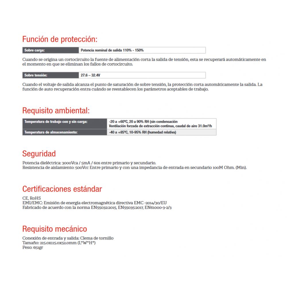 - Voltaje de salida: 24Vcc