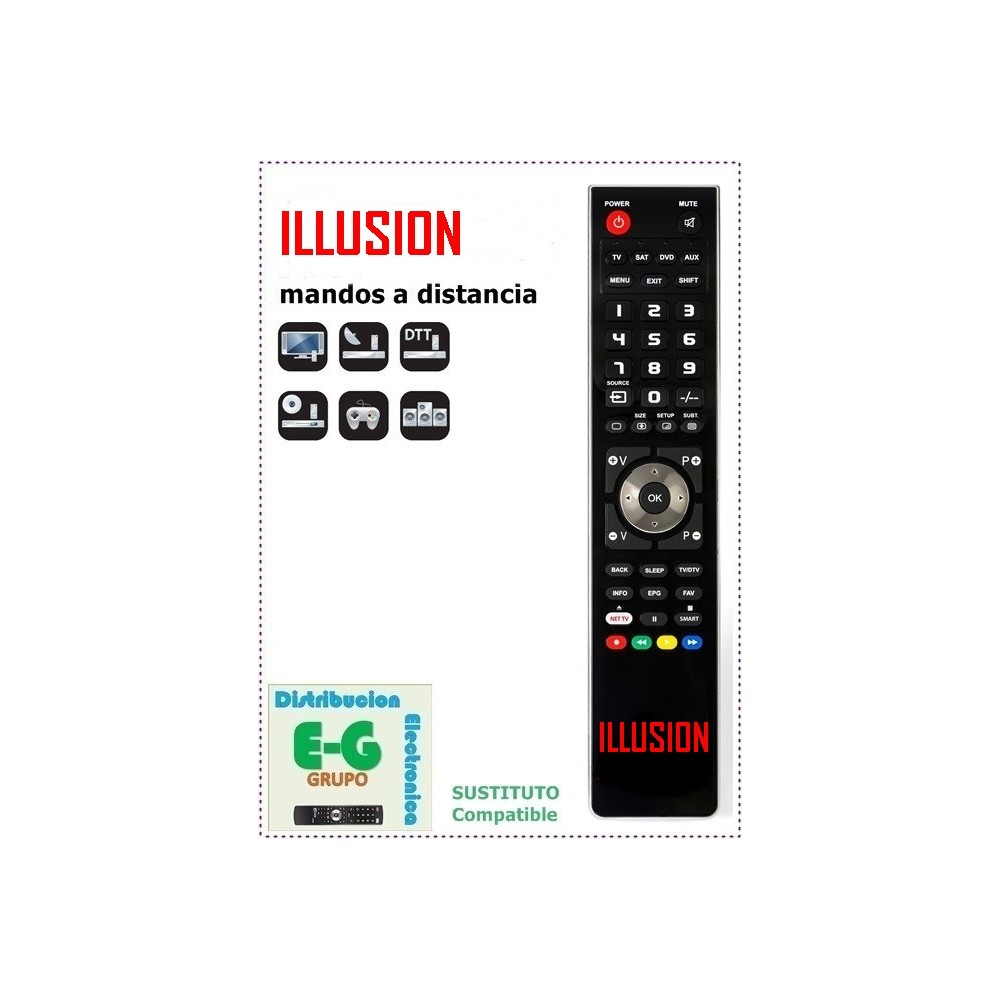 Para sustituir tú mando a distancia original ILLUSION. Sustituye a todos los modelos ILLUSION del mercado. Diseñado con una nueva e innovadora tecnología, se puede programar para funcionar en tu TV, DVD, VCR, SAT, TDT, AUX, HIFI, VIDEOCONSOLAS, PROYECTORES.. .  Con este mando se puede acceder a todas las funciones. Es un Mando de Sustitución del OriginalNo es un Mando Universal. No requiere código de configuración. Nosotros Te enviaremos su sustituto ILLUSION programado para el modelo que nos indiques. Pon las pilas AAA (no incluidas), y comienza a utilizar tu Mando.