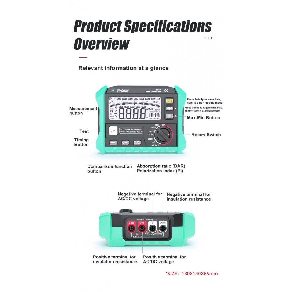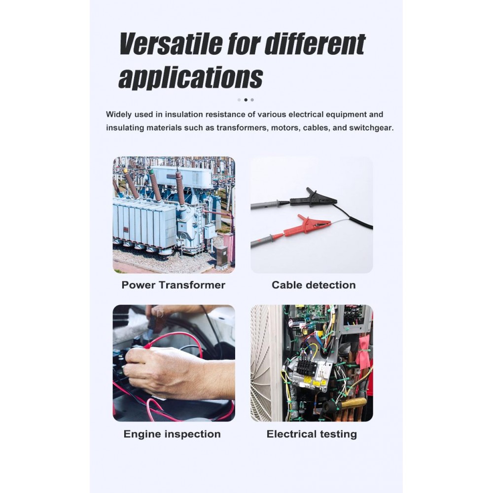 Este medidor de aislamiento está diseñado para probar la resistencia de aislamiento en sistemas de alimentación, equipos eléctricos, cables, etc., cumpliendo con las normas internacionales de seguridad IEC61010-1.