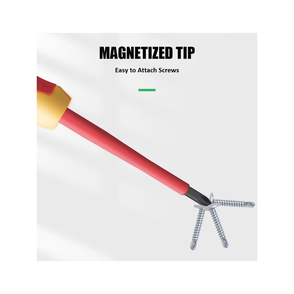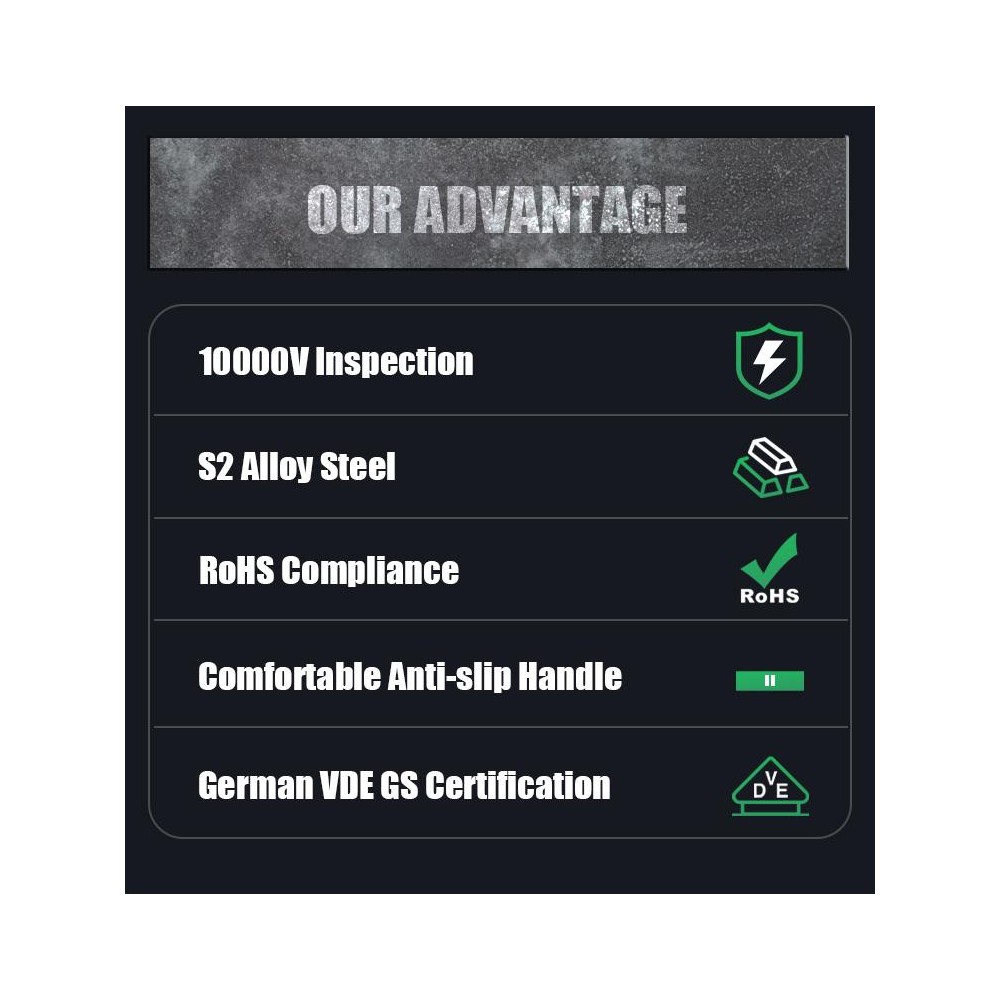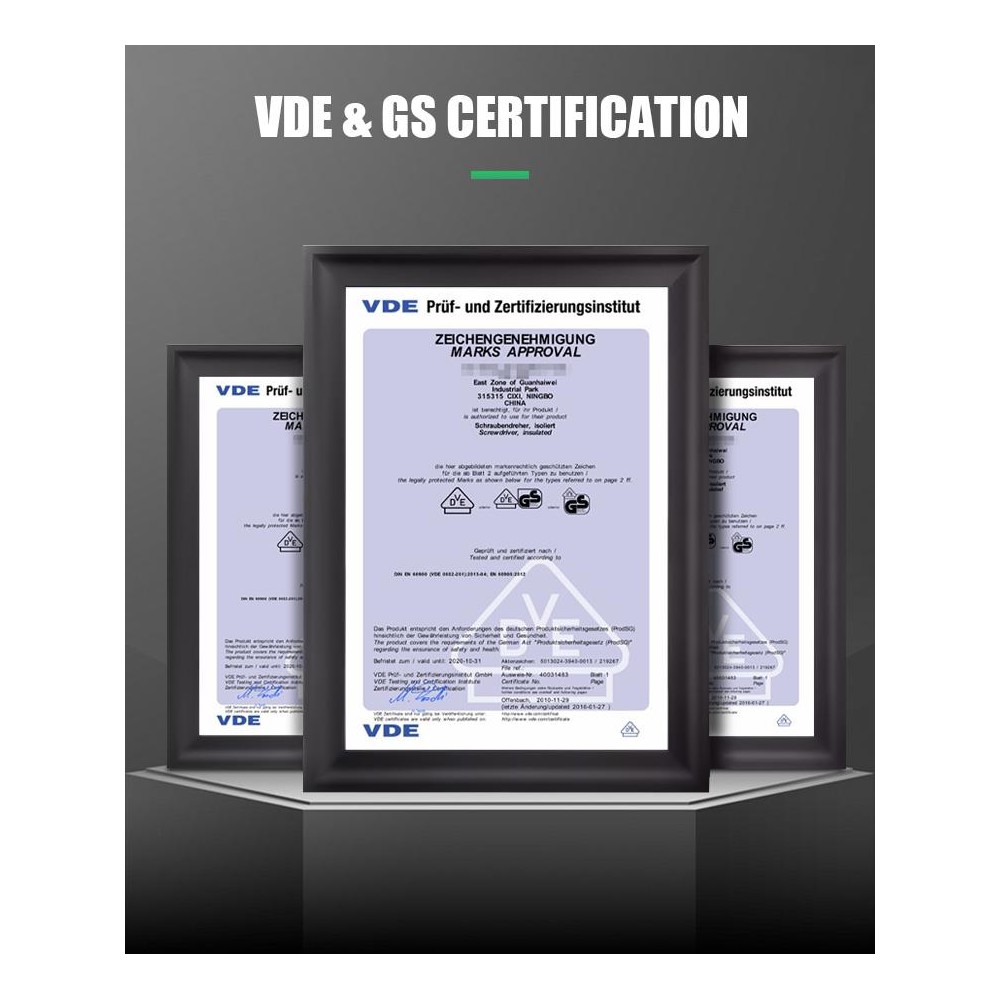 Certificado según las normas de seguridad IEC/DIN EN 60900 1000V VDE. Diseño de empuñadura ergonómica moldeada de alta visibilidad para máxima comodidad. Incluye 7 destornilladores aislados y 4 alicates aislados para satisfacer la mayoría de las aplicaciones.