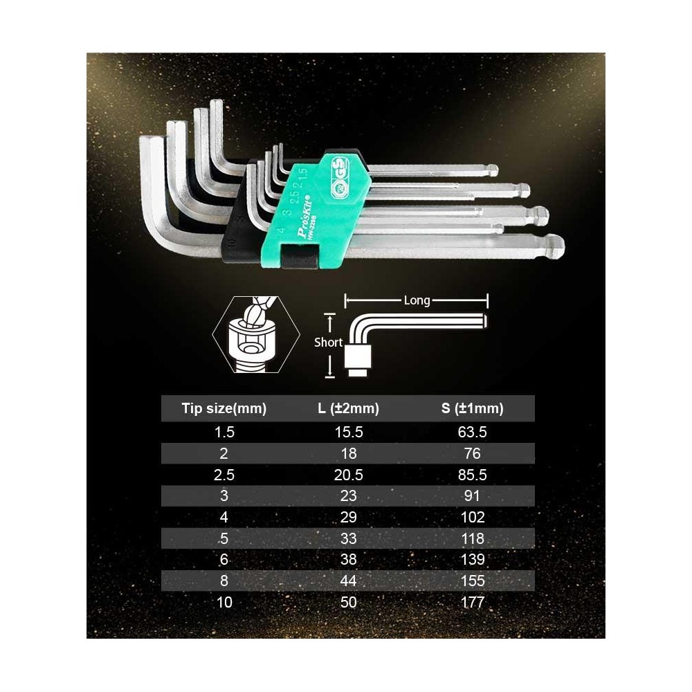 Conjunto de 9 llaves allen hexagonales de Proskit - HW-129B