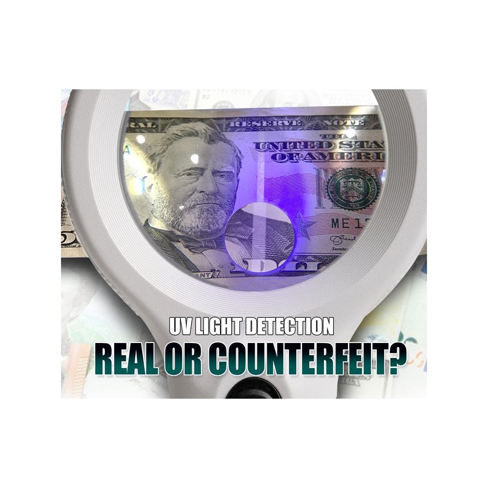 Práctica y manejable lupa para lectura e inspección con luz LED y UV, idónea para la detección billetes, pasaportes y otros objetos fraudulentos, gracias a su luz UV.
