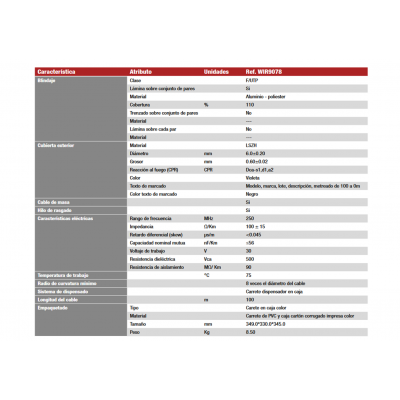 | Exterior | 6,2mm ±0.2mm Diá., PVC Violeta libre de halógenos LSZH |