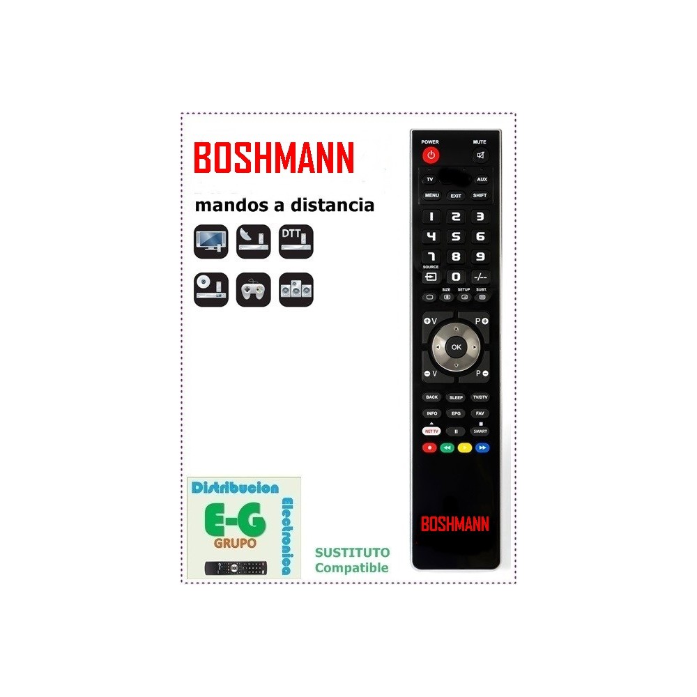 Para sustituir tú mando a distancia original BOSHMANN. Sustituye a todos los modelos BOSHMANN del mercado. Diseñado con una nueva e innovadora tecnología, se puede programar para funcionar en tu TV, DVD, VCR, SAT, TDT, AUX, HIFI, VIDEOCONSOLAS, PROYECTORES.. .  Con este mando se puede acceder a todas las funciones. Es un Mando de Sustitución del OriginalNo es un Mando Universal. No requiere código de configuración. Nosotros Te enviaremos su sustituto BOSHMANN programado para el modelo que nos indiques. Pon las pilas AAA (no incluidas), y comienza a utilizar tu Mando.